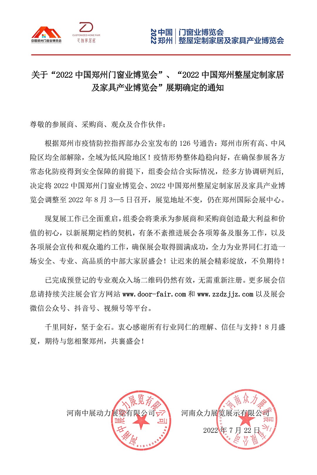 关于“2022中国郑州门窗业博览会”“2022中国郑州整屋定制家居及家具产业博览会”展期确定的通知