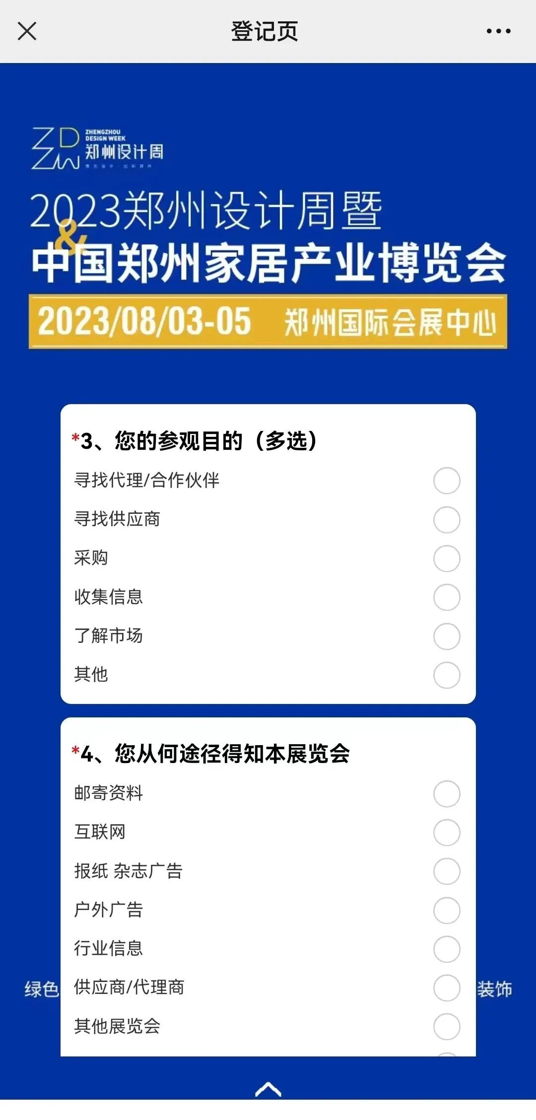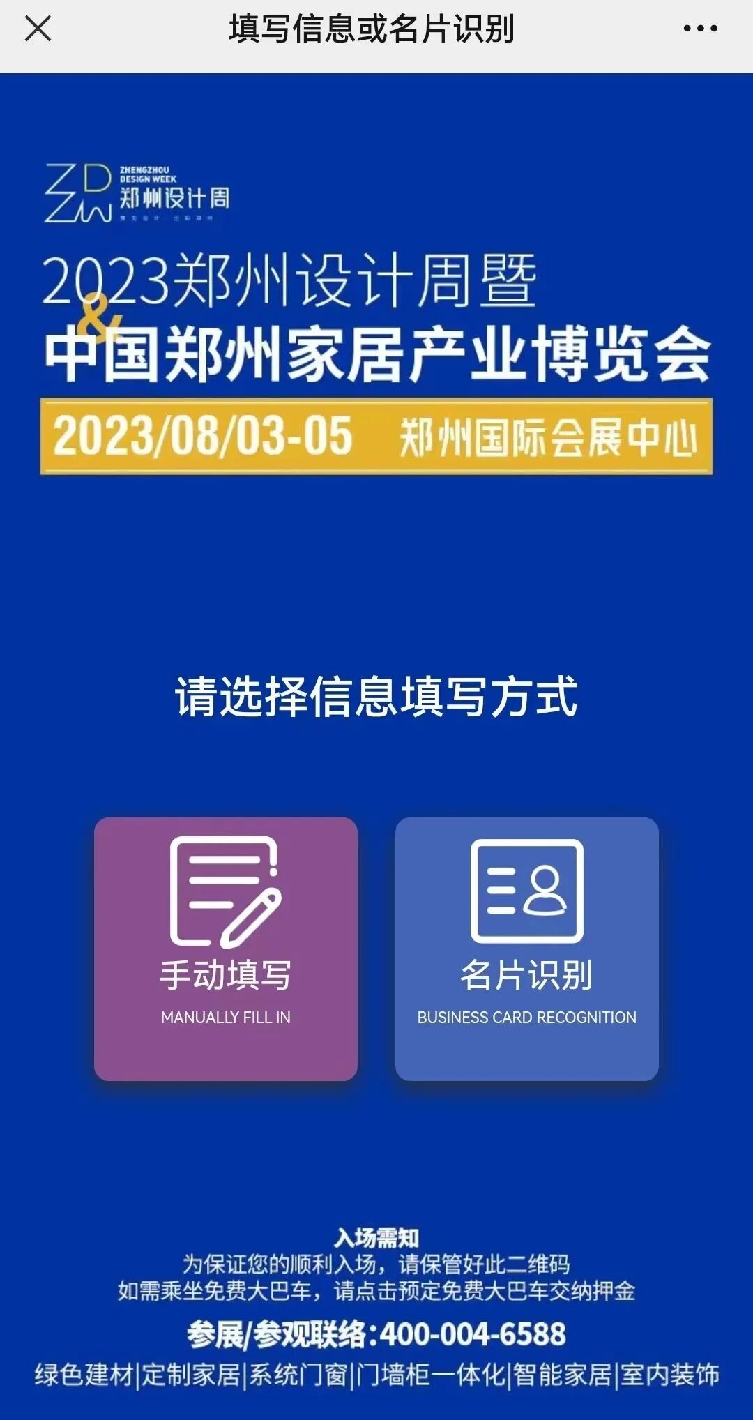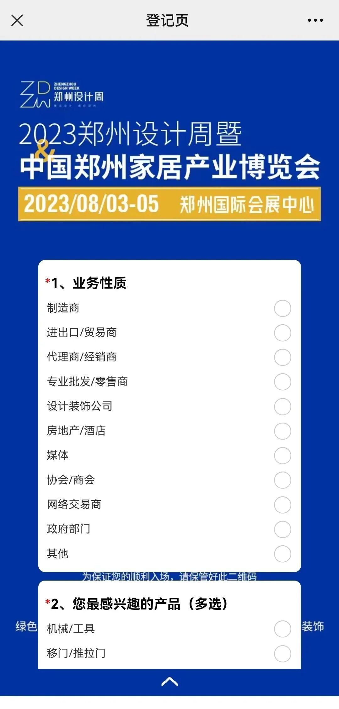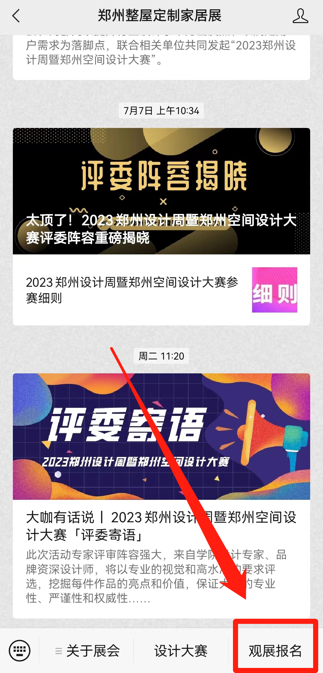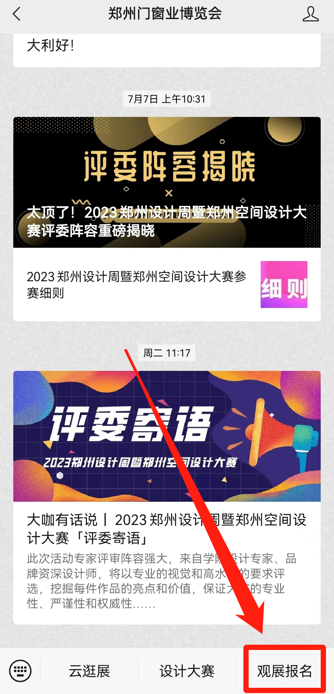 方式二:关注“郑州门窗业博览会”或“郑州整屋定制家居展”官方公众号,点击下方“观展报名”菜单栏。