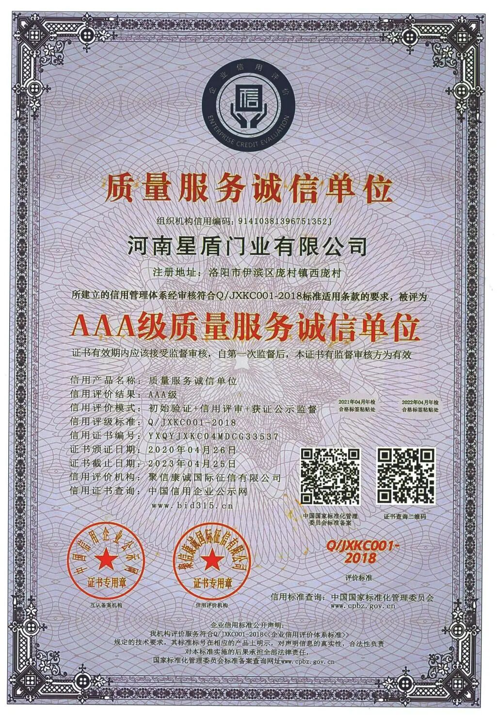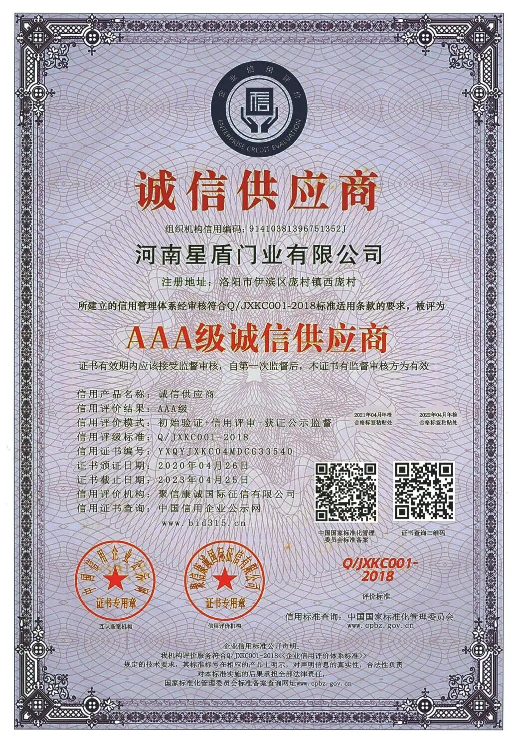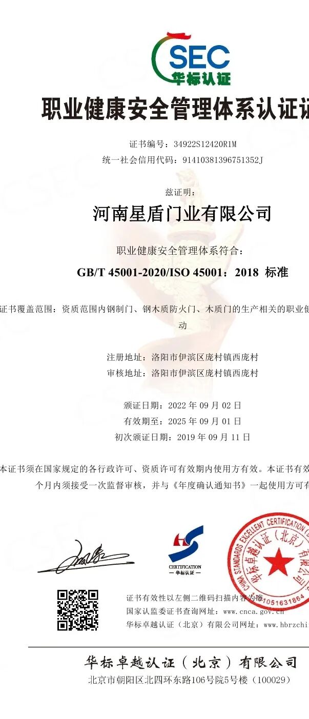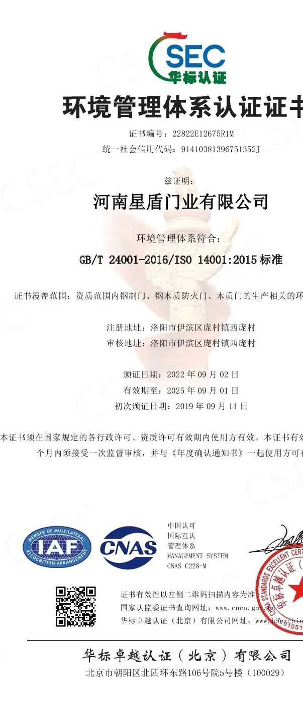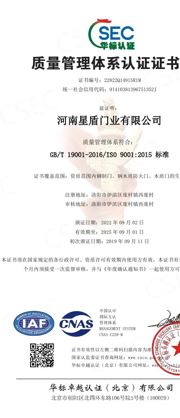 河南星盾门业有限公司在2003年已通过公安部消防产品合格评定中心认证,十多年来一直从事防火门产品的生产和研发,现已通过ISO 9001:2015质量管理体系认证、 ISO14001:2015环境管理体系认证和GB/T45001-2020/ISO 45001:2018职业健康安全管理体系认证。