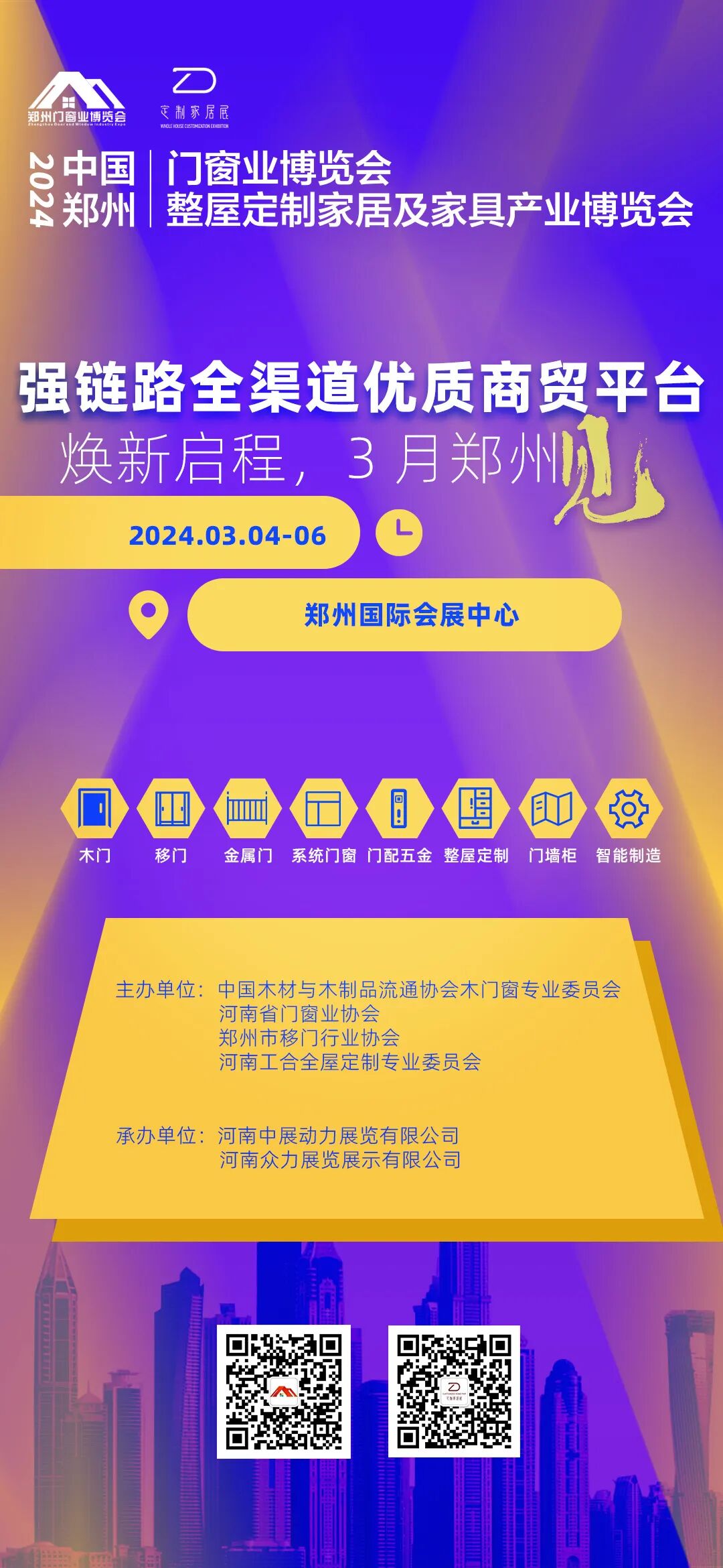 2024郑州门窗业暨整屋定制家居及家具产业博览会,将于3月4日--6日,在郑州国际会展中心盛大开幕!本届展览规模 100000平方米,汇聚门窗家居行业精英,以品牌号召力和行业影响力为依托,获中国木材与木制品流通协会木门窗专业委员会等权威协会机构鼎力支持。同期举办多场高端会议,大咖齐聚,把脉行业发展趋势,超多亮点,超多新品,成为行业企业选新品、找合作、抢先机、拓市场不可错过的首选盛会!