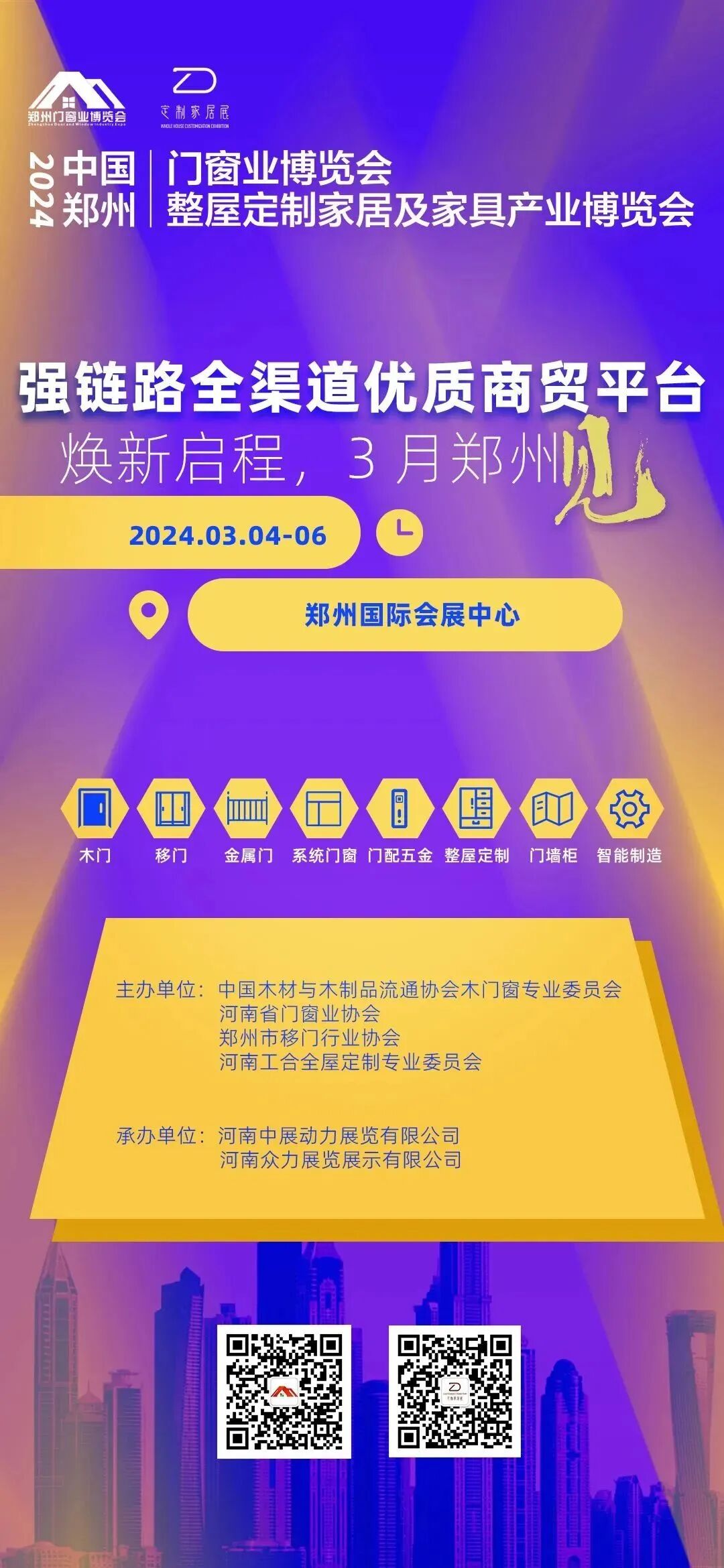 2024中国郑州门窗业暨整屋定制家居及家具产业博览会,将于3月4日-6日在郑州CBD国际会展中心盛大召开!
