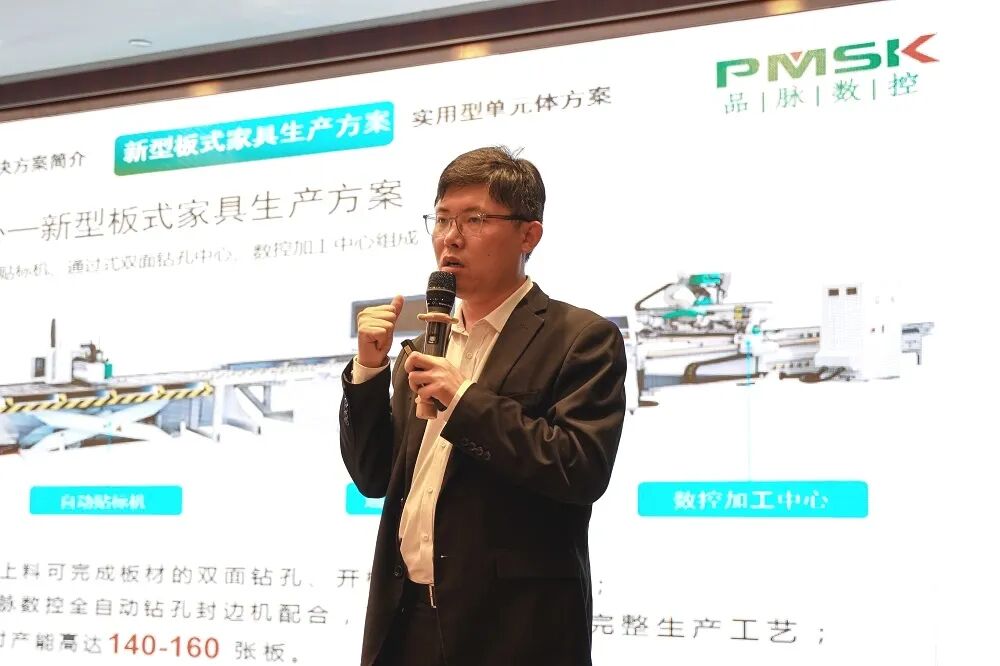 品脉数控销售部经理徐晓辉作了《品脉数控智能自动化助力家具企业降本增效》的技术分享,围绕品牌介绍、主营产品、智能工厂解决方案、新型板式家具生产方案、实用型单元体方案等五个方面,结合各地区产品落地案例,向大家详细介绍如何通过自动化设备来提高生产效率、降低人工成本,利用数字化与智能化相结合的方式助力企业实现转型升级。