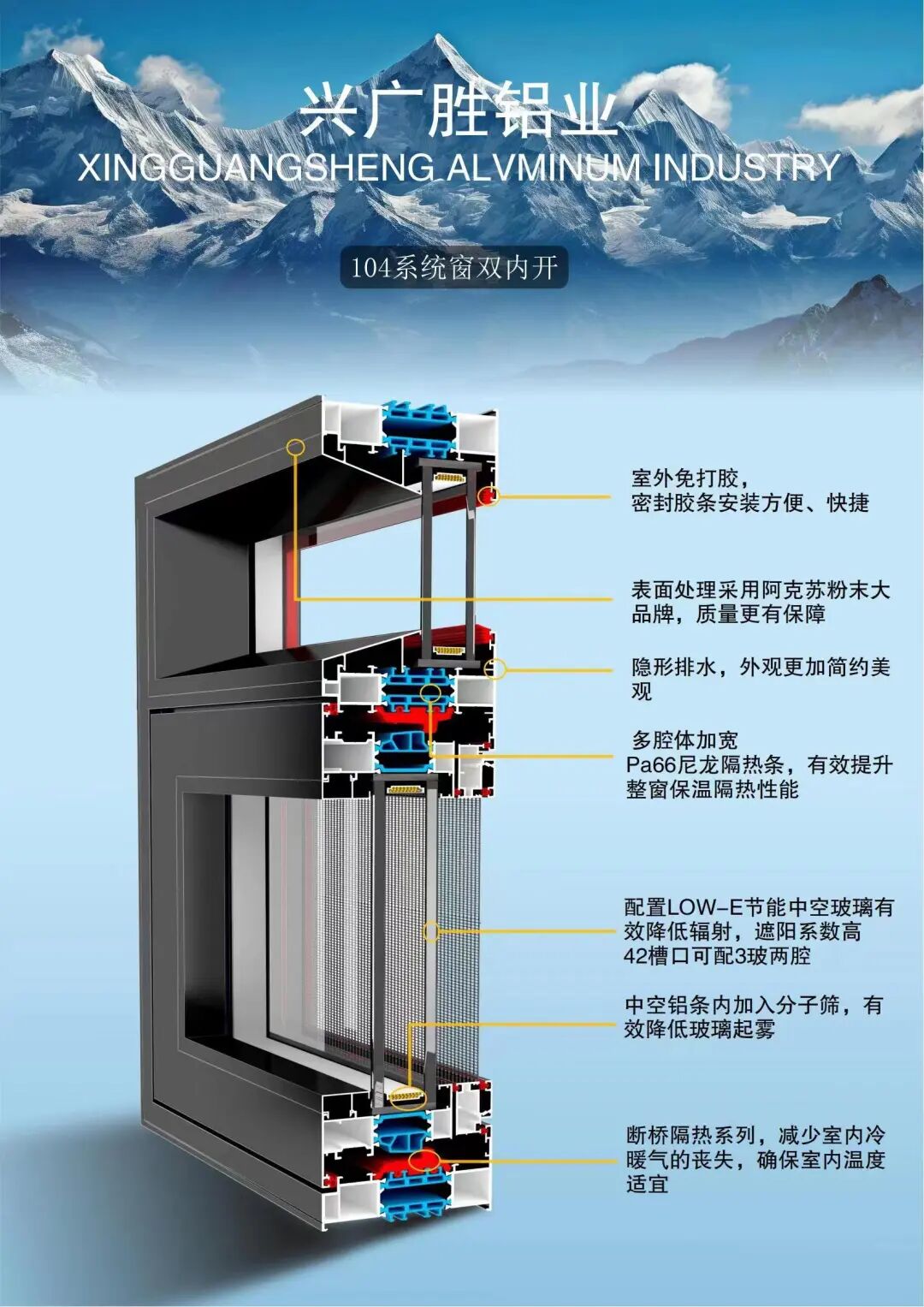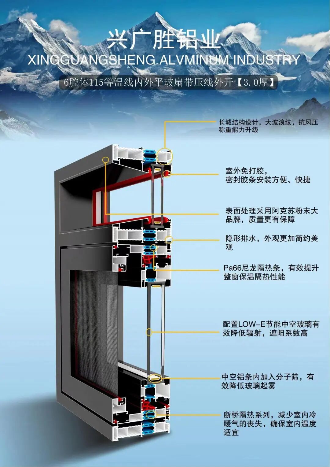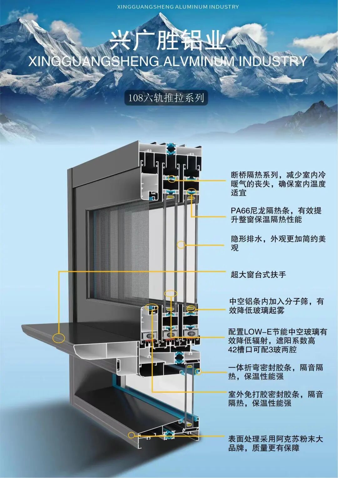 广东兴广胜铝业是一家集开发、生产、销售为一体的综合性企业,拥有一批强有力的生产技术人员及雄厚的综合开发能力。公司主要生产各类高档高端节能门窗。公司严格执行ISO9001-2000国际标准贯穿至每一个环节。产品采用国际先进喷涂技术及全套德国进口设备,确保产品具有环保、耐用、防潮、耐腐蚀、不褪色、隔音好的特点。