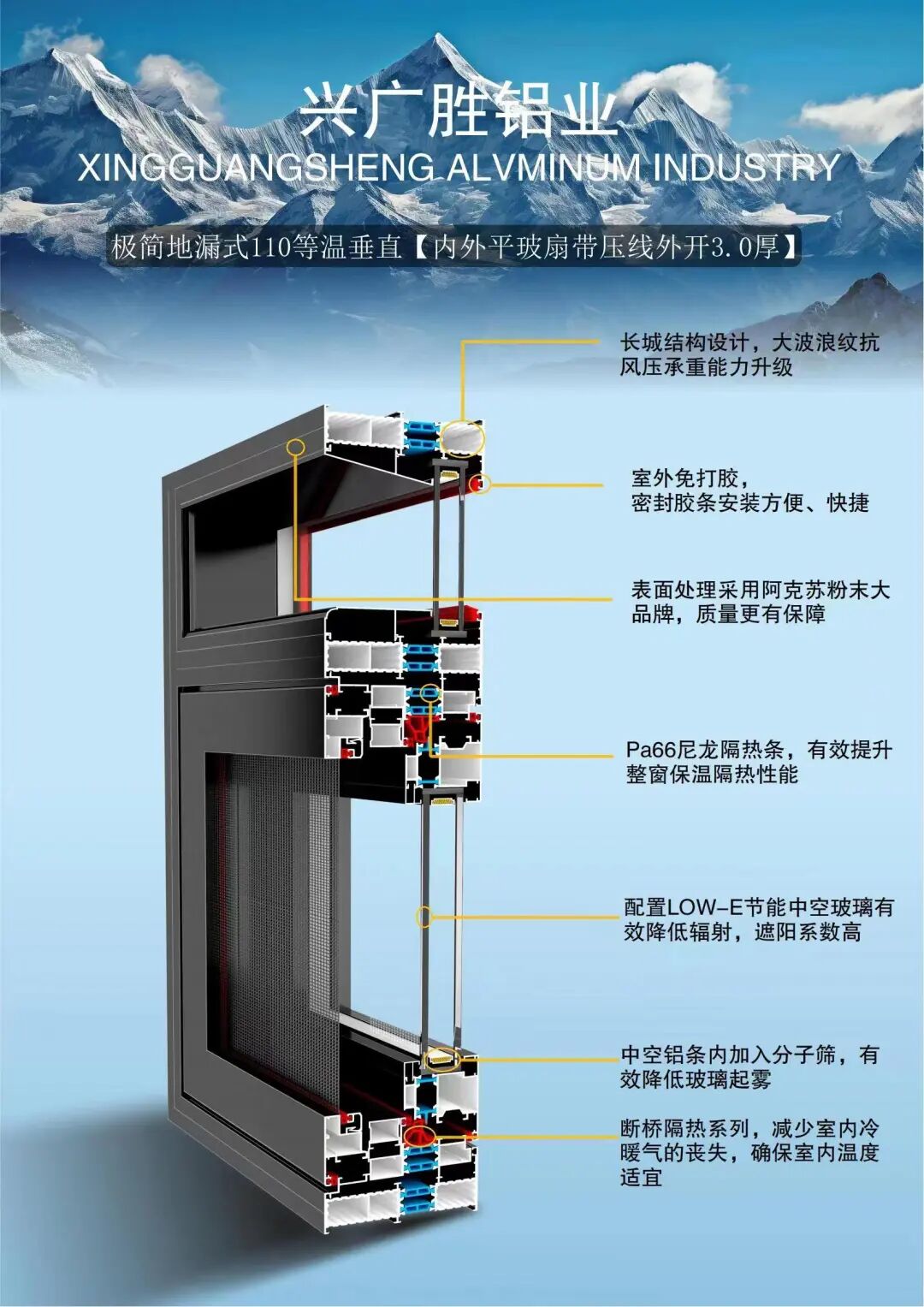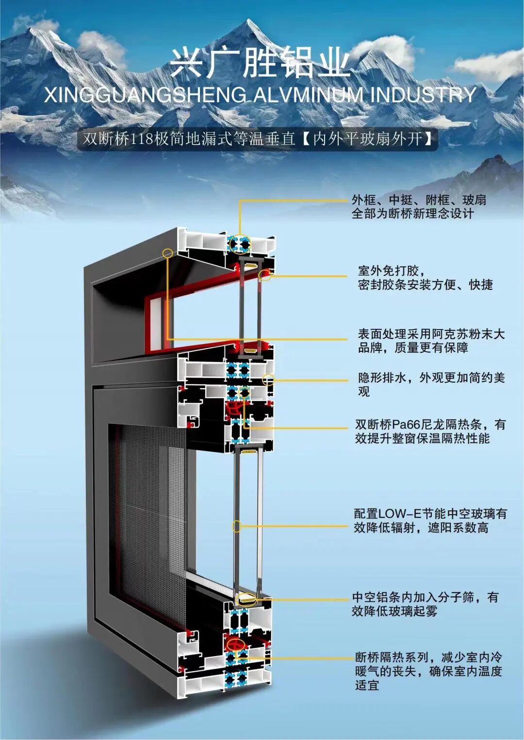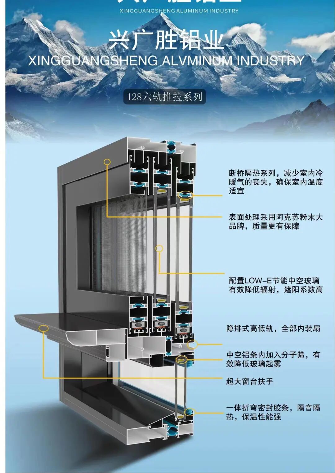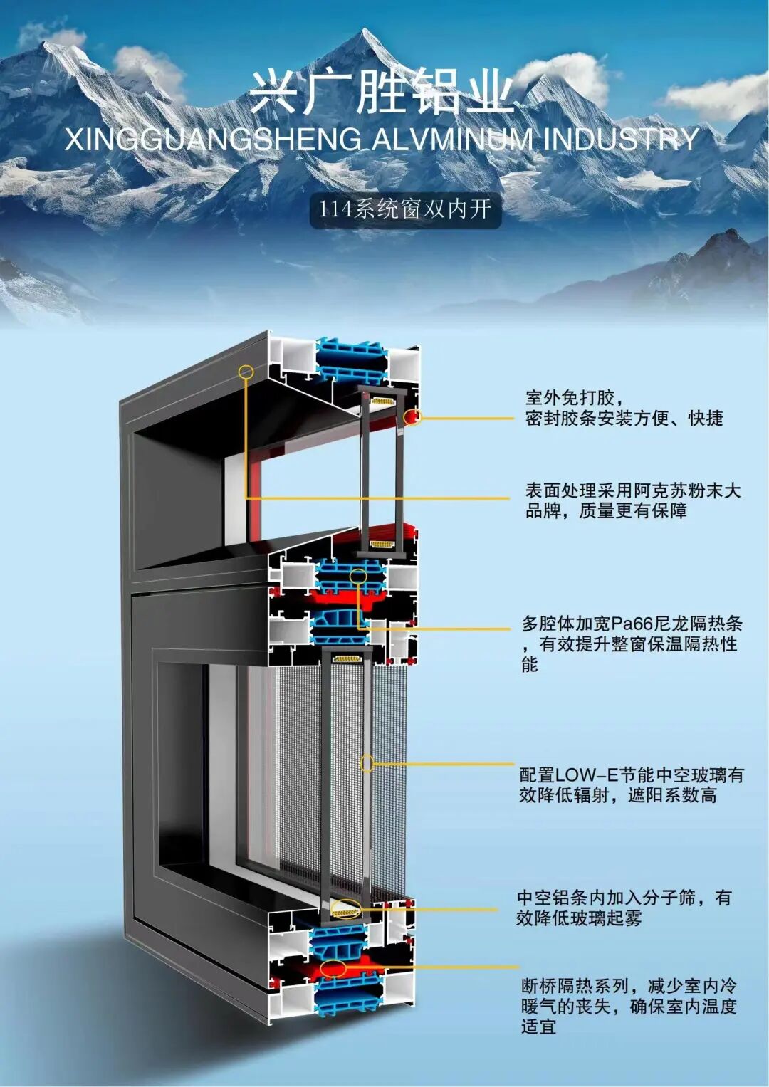 广东兴广胜铝业是一家集开发、生产、销售为一体的综合性企业,拥有一批强有力的生产技术人员及雄厚的综合开发能力。公司主要生产各类高档高端节能门窗。公司严格执行ISO9001-2000国际标准贯穿至每一个环节。产品采用国际先进喷涂技术及全套德国进口设备,确保产品具有环保、耐用、防潮、耐腐蚀、不褪色、隔音好的特点。