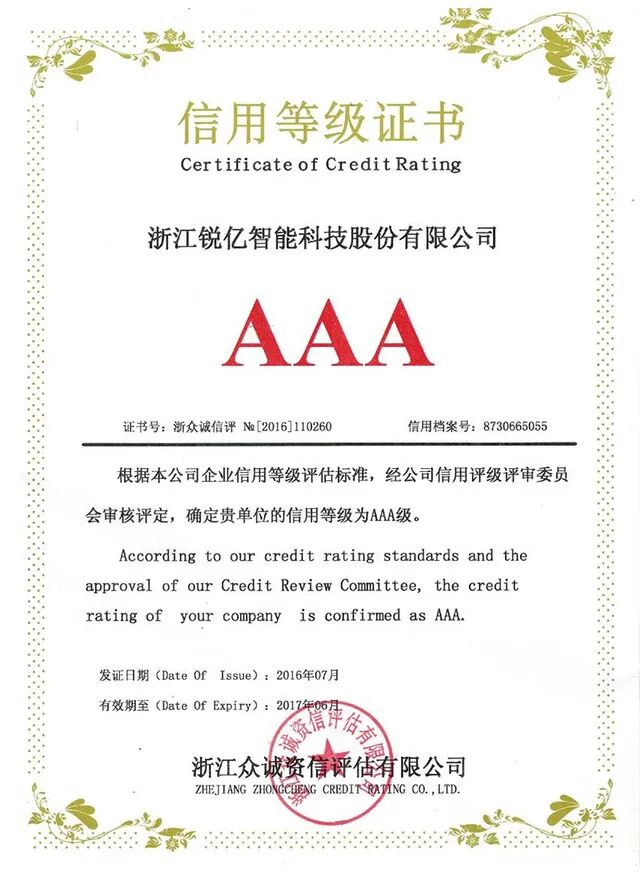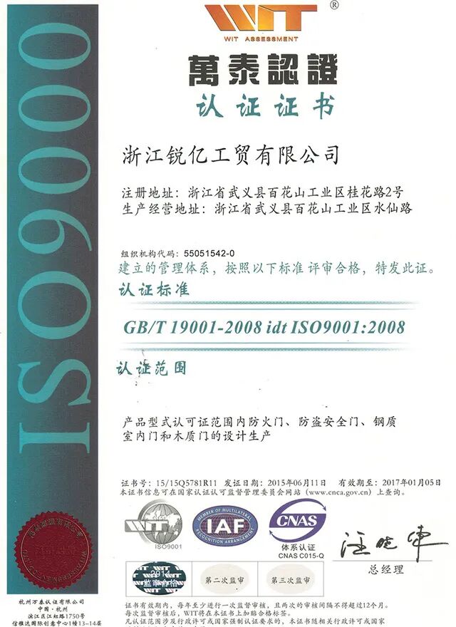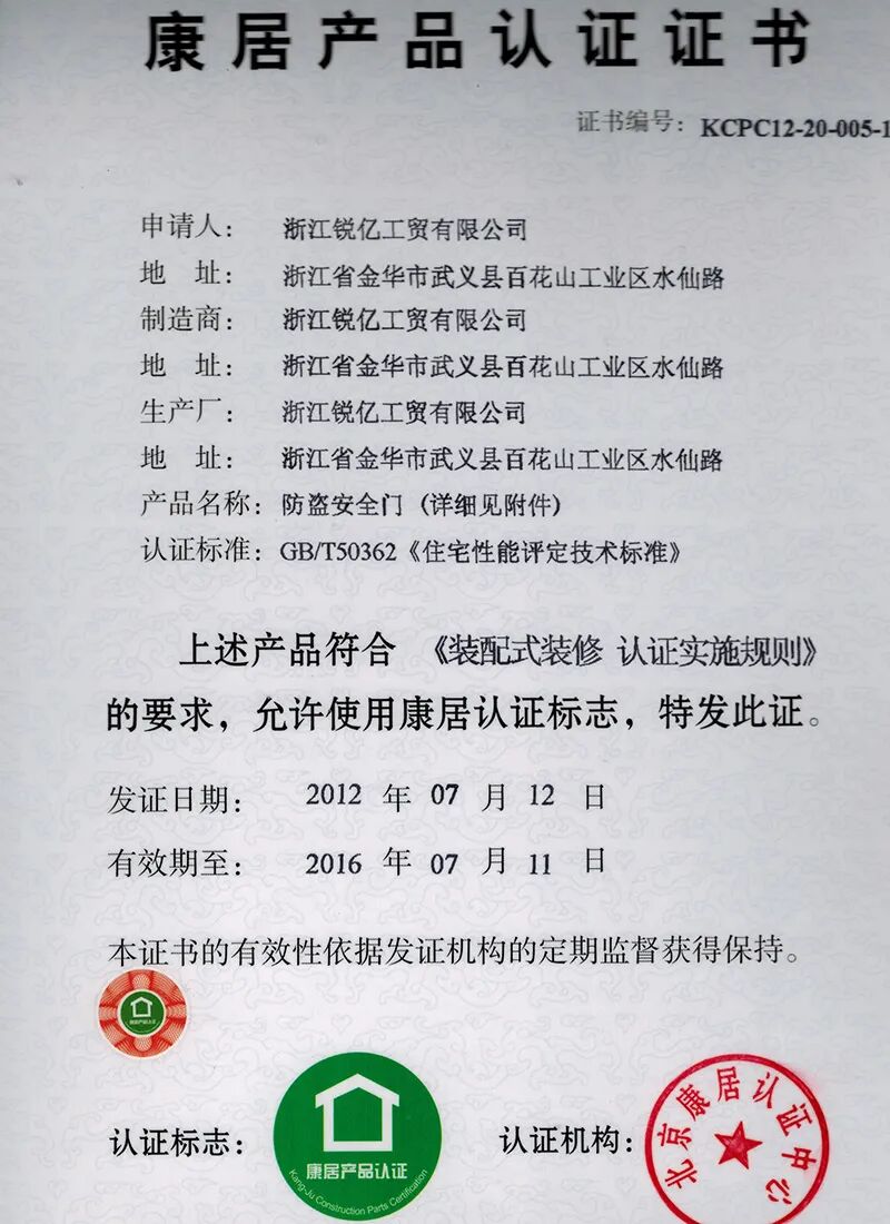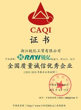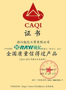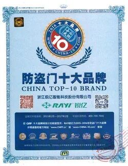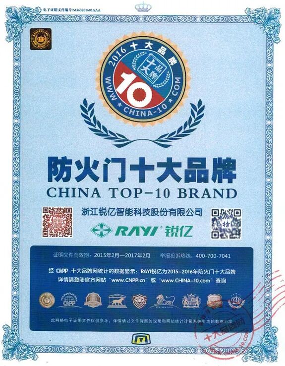 自2012年经十大品牌网数据统计,认证“锐亿”为防盗门十大品牌、防火门十大品牌、木门十大品牌。2015年被中 国质量检验协会评定为全国质量信得过产品、全国质量检验稳定合格产品、全国质量诚信企业。