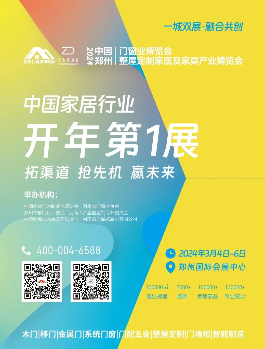 2024年3月4日-6日,2024中国郑州门窗业暨整屋定制家居及家具产业博览会将在郑州国际会展中心盛大举行。100000㎡展览规模,7大主题展区,3000家展商齐聚,为产业链上下游品牌提供集交流对话、新品展示、招商加盟等高效合作平台,打造全国大家居行业开年大展!