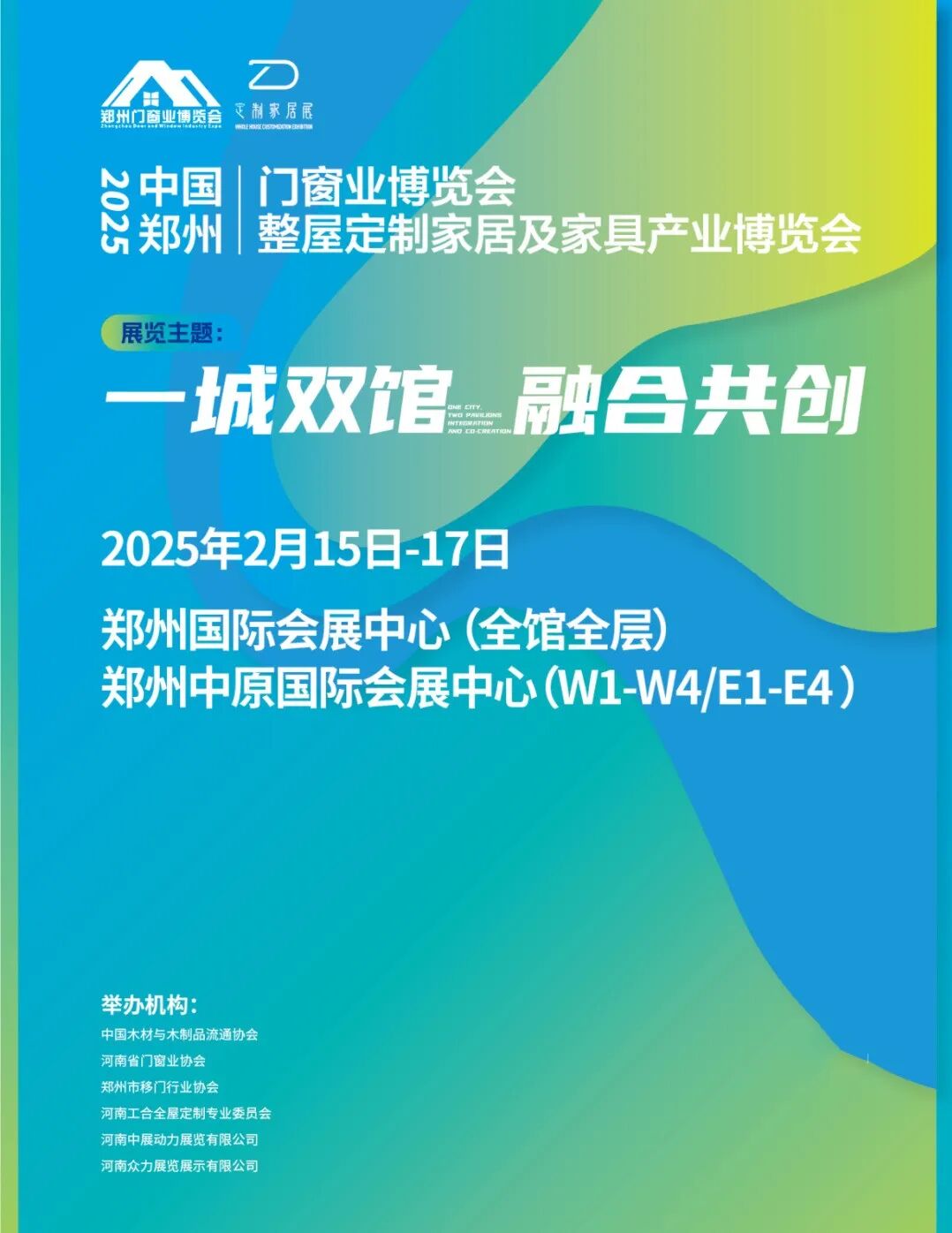 一城双馆,融合共创。2025中国郑州门窗业暨整屋定制家居展将于2025年2月15日-17日,在郑州CBD国际会展中心(全馆全层)和郑州中原国际会展中心(W1-W4/E1-E4)同期召开,期待届时与大家再聚首!