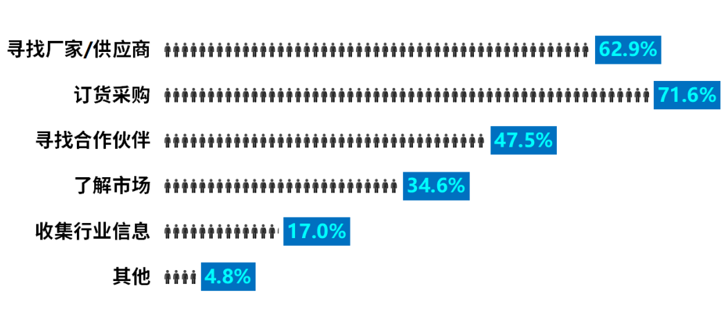 从观众参观目的分析,本届展会观众大多为订货采购、寻找厂家/供应商、寻找合作伙伴,其次为收集行业相关信息,了解大家居市场行情,与同行现场交流学习。