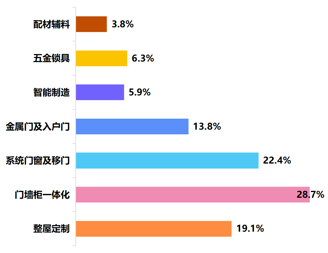本届展会门窗及定制家居产业链上下游品牌悉数参展,其中门墙柜一体化、系统门窗及移门、整屋定制等品类展商占比最高,分别占比28.7%、22.4%、19.1%,可见参展品类在逐渐丰富化、多元化。