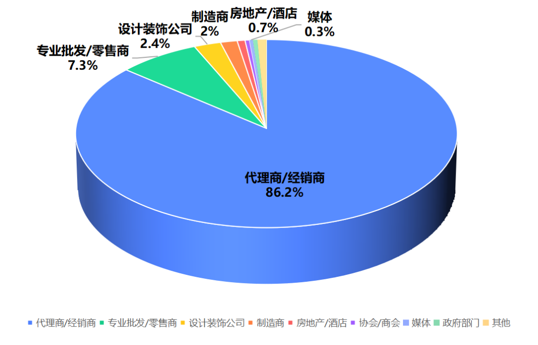 从观众行业性质分析,2024郑州门窗业暨整屋定制家居展观众渠道来源广泛,其中代理商/经销商、专业批发/零售商、设计装饰公司分别以86.2%、7.3%、2.4%的占比位列前三。