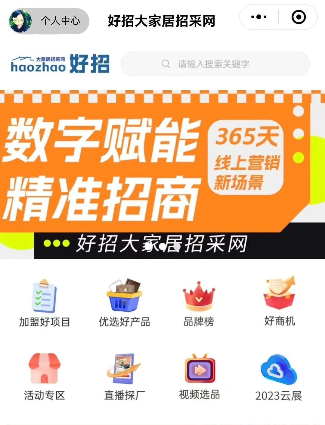 本届展会还将沿用“线上+线下”的双线办展模式,通过云端小程序“好招大家居招采网”的各项功能,为参展企业搭建线上品牌专属展厅,打造集产品展示、招商发布、直播互动、在线洽谈等于一体的缤纷云展,实现365天展会不落幕的全新参展体验,助力展会大范围、高层次、强密度的亿级传播,实现参展效果最大化!