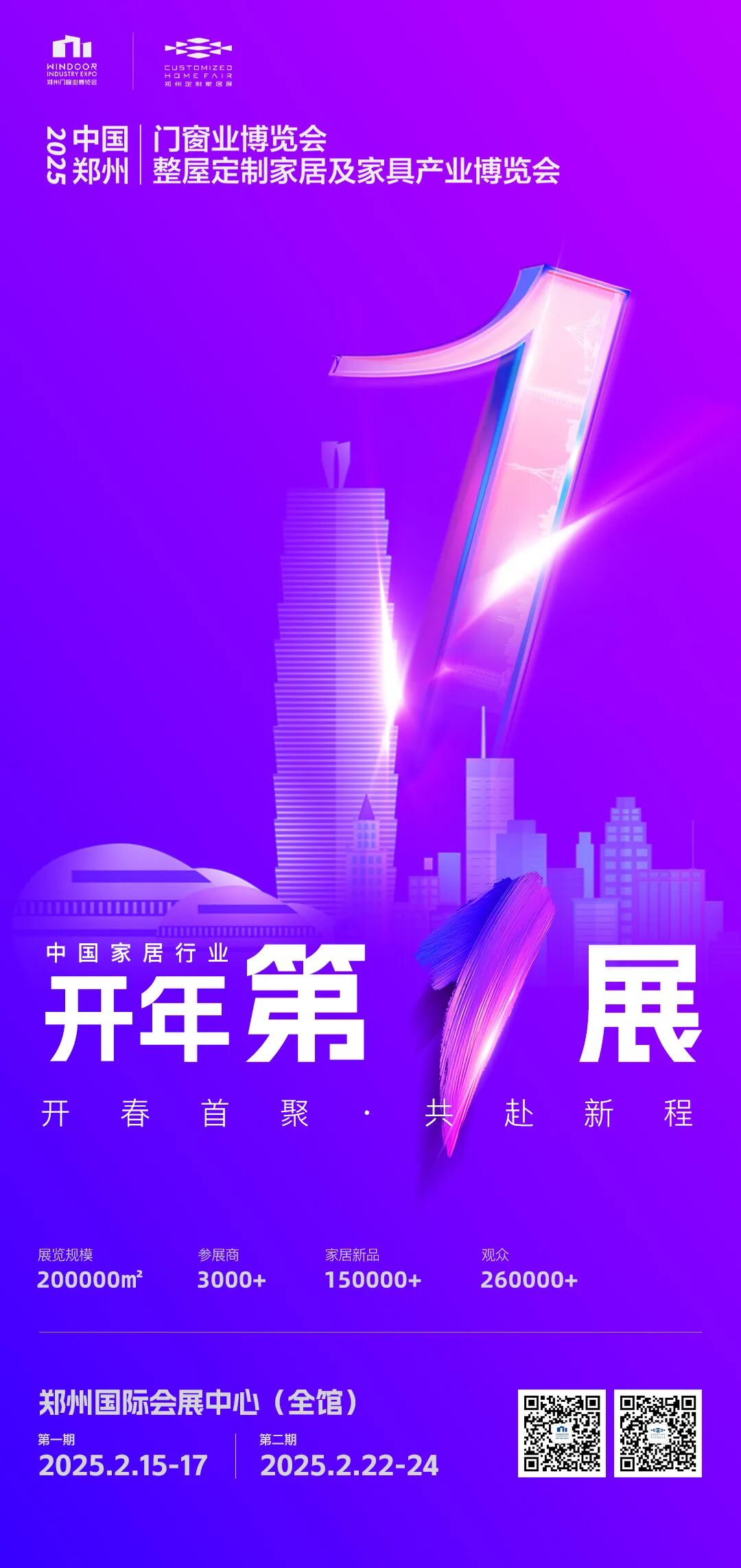 为响应国家政策号召,助力家居产业转型升级,由中国木材与木制品流通协会、河南省门窗业协会、郑州市移门行业协会、河南工合全屋定制专业委员会、河南中展动力展览有限公司、河南众力展览展示有限公司联合举办的2025中国郑州门窗业暨整屋定制家居及家具产业博览会,将于2025年2月15-17日、2月22-24日,分两期在郑州国际会展中心盛大举行!