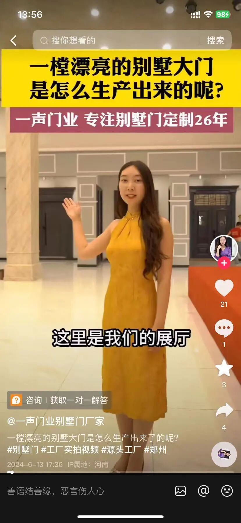 汇聚榜样力量,引领行业风向。郑州门窗业暨整屋定制家居展,聚焦家居建材产业的发展,特打造“品牌大咖说”栏目,旨在挖掘门窗家居行业各品牌负责人、产业引导者在行业内精耕细作、锐意进取的品牌故事,记录家居领军人物对优选建材的美学新认知,以及在新产品、新技术、新模式等方面做出的卓越探索。本期,我们专访对话一声门业总经理乔攀静,看一声门业如何以美学设计为引领,打造高品质别墅门。