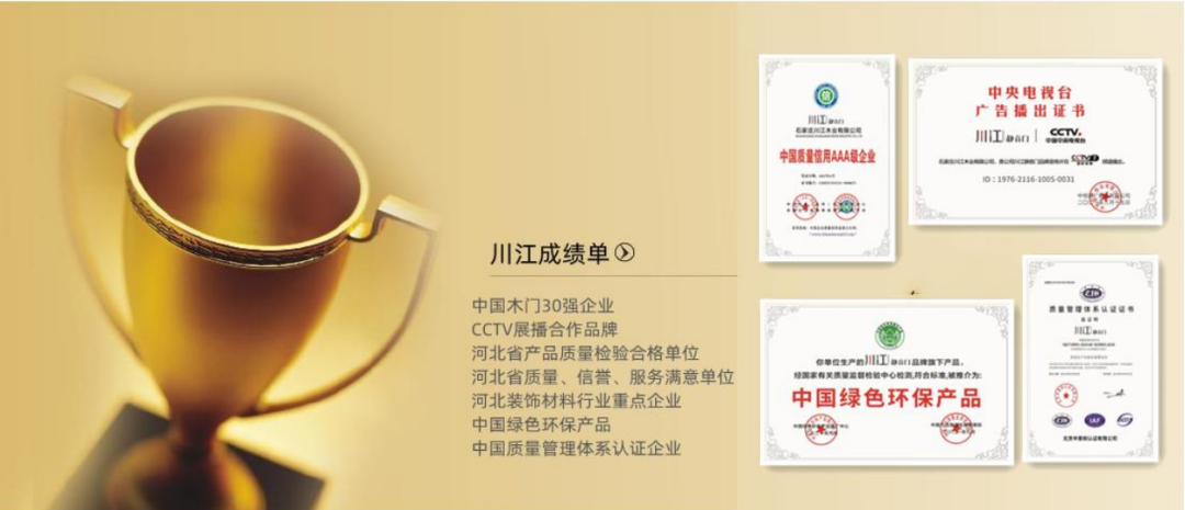 川江门业产品在河北、河南、山东、山西、陕甘宁、内蒙等地拥有极高的知名度。“央视上榜品牌”、“中国著名商标”、“装饰材料行业质量信誉服务示范单位、AAA企业”、“中国315诚信企业”、“中国木门30强企业”等荣誉地获得,彰显了一流的品牌力!
