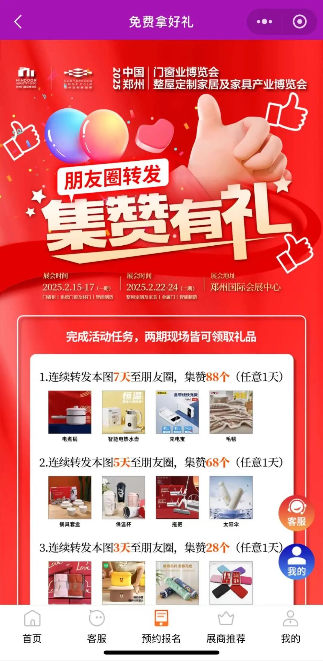 专业观众任意转发展商云展台/展会活动至朋友圈/抖音,完成集赞任务,即可在展会现场领取精美礼品。