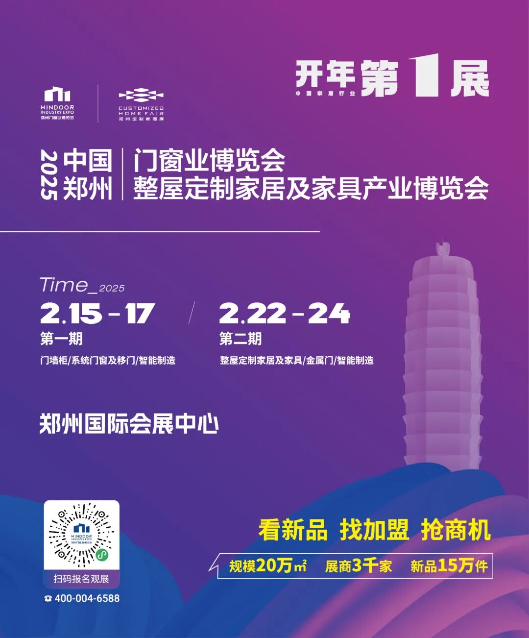 2025郑州门窗业暨整屋定制家居及家具产业博览会将于2025年2月15-17日/2月22-24日,分两期在郑州国际会展中心举行!作为2025年度重磅盛会,本届展会以20万㎡展览面积,26个室内展馆+4个室外展馆全面展示产业链上下游新产品、新技术、新趋势,为家居行业搭建共寻商机、共谋发展的优质平台。