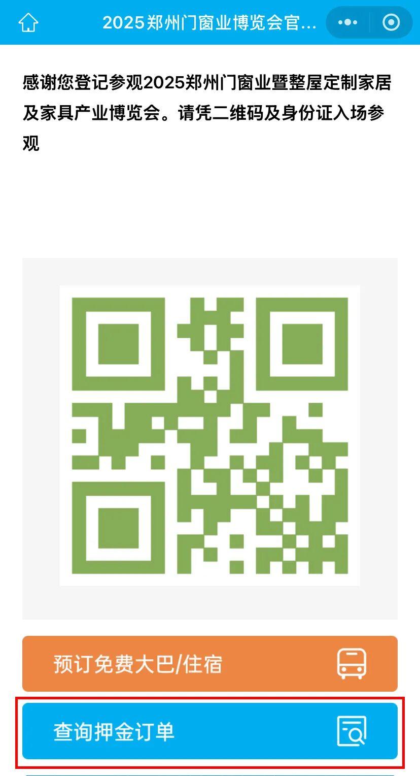 点击【郑州门窗业博览会】或【郑州整屋定制家居展】的公众号,点击菜单栏“观展报名”,即可弹出电子参观二维码。