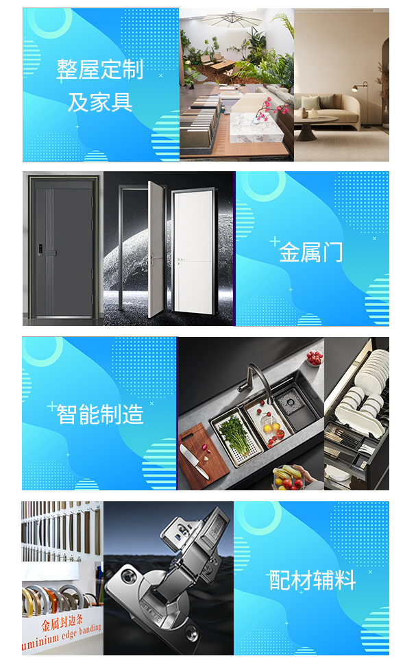 展会第二期展品涵盖全屋定制、板材、门墙柜一体化、家具、五金锁具、金属门、庭院门、非标门、国标门、入户门、别墅门、智能锁、门配五金、智能制造、木工机械等全链新品,琳琅满目,应有尽有,满足各类采购需求,助力企业拓展更为广阔的合作生态圈;各展馆相辅相成,完整呈现家居上下游产业链品牌,为采购群体精心打造一站式全品类商贸解决方案。