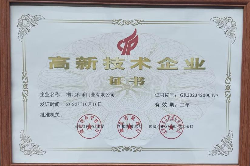 公司自成立以来,凭借稳健发展和持续创新,获得社会广泛认可,通过ISO 9000/14000/45000质量、环境、职业健康安全管理体系认证,取得消防产品认证资质;并获得“高新技术企业”“2024湖北精品”“2023年度国家知识产权优势企业”“湖北省企业技术中心”“湖北省智能制造试点示范企业”“省级工业设计中心”“湖北省专精特新小巨人企业”“湖北省信息化和工业化融合试点示范企业”“湖北省门业协会执行会长单位”“咸宁市门产品智能制造工程技术研究中心”“科学技术成果评价证书”等荣誉。被万科、中海、龙湖等众多头部地产企业授予“优秀合作单位”“年度优秀供应商”“年度战略供应商”“年度优秀配合团队”等荣誉,体现了社会和广大用户对公司的关注和认可。