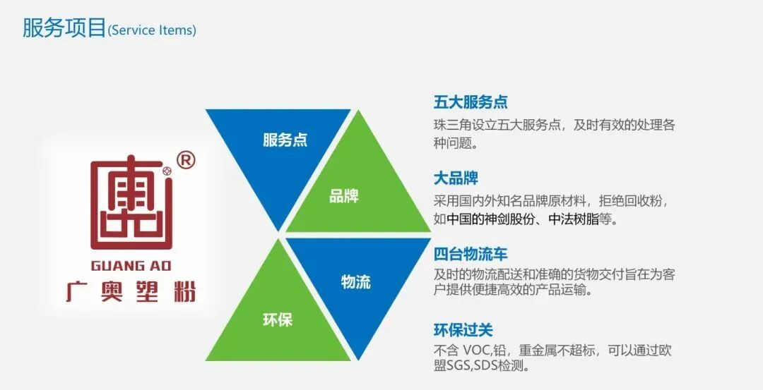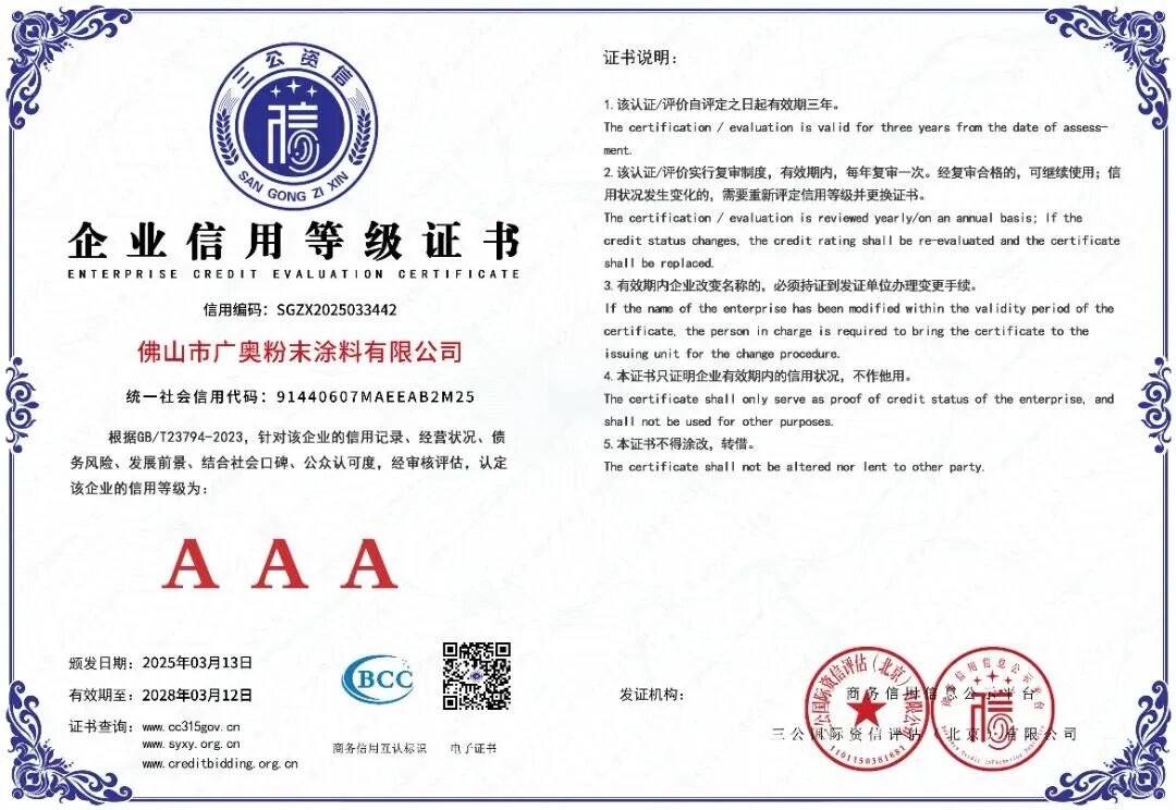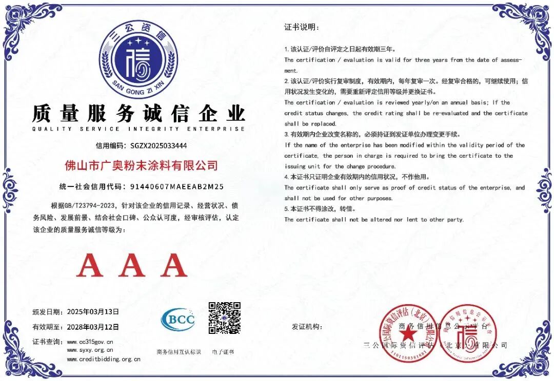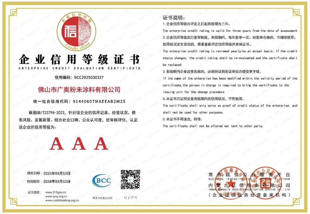 公司通过ISO9001,14001,及IATF16949汽车的认证,美国UL认证,环保产品按SGS要求符合ROHS指标。其中广奥塑粉为高端门业和铝艺,立德粉末为设备工程五金行业,标彩粉末为铝材及铝制品行业。